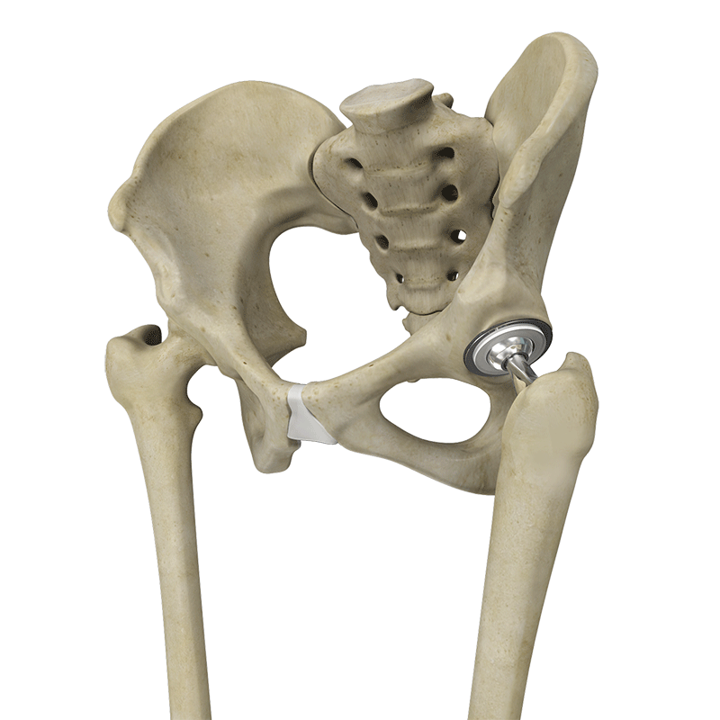 Implanta la articulación protésica en la pélvis para reemplazar la articulación dañada.